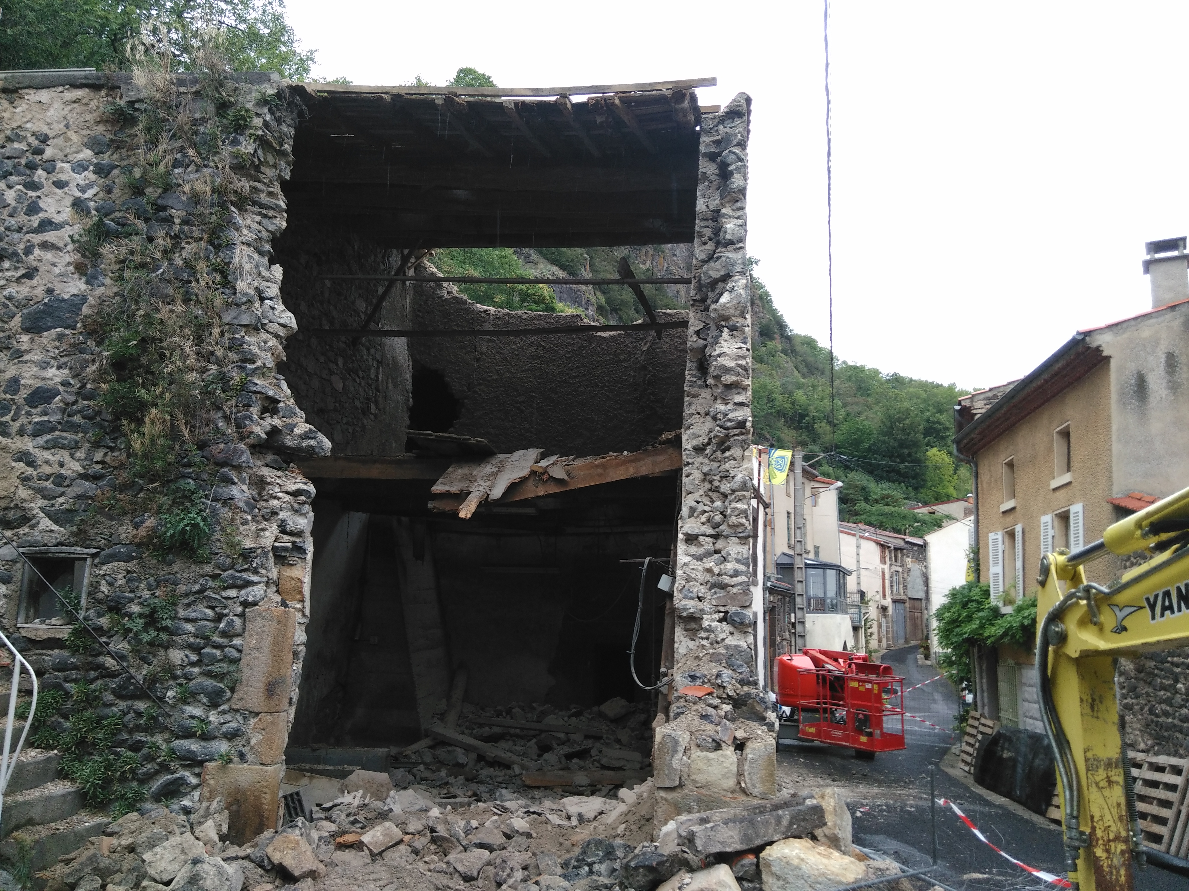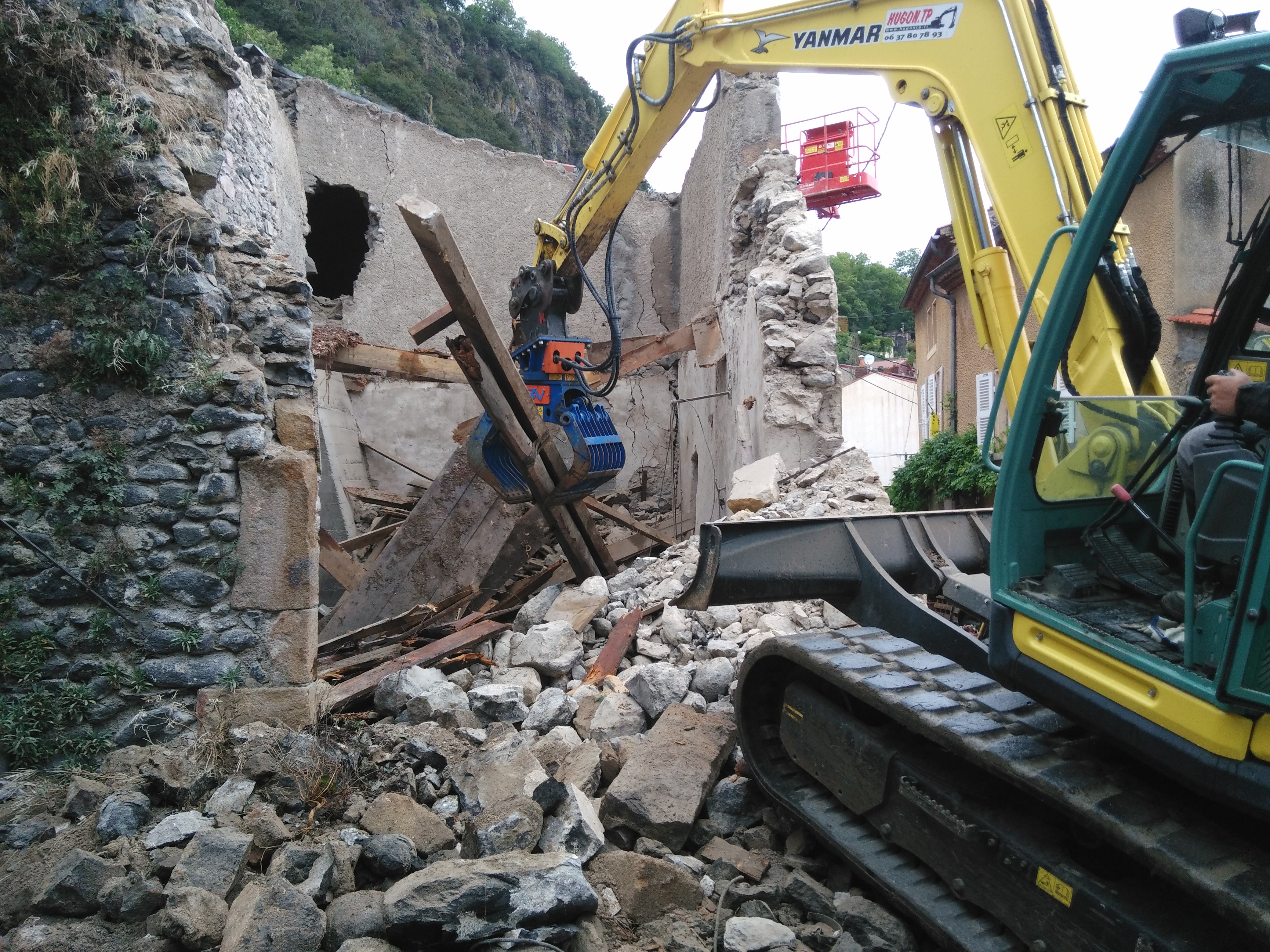 Démolition contrôlée d'une maison en pierre fortement dégradée. À l’aide d’une pelle hydraulique, la façade et une partie de la charpente ont été démolis. Le chantier s’est déroulé en zone habitée avec présence de lignes aériennes.